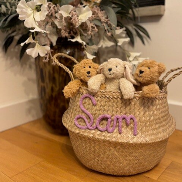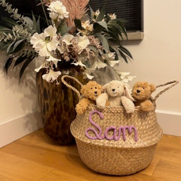 De mand is gemaakt van natuurlijk zeegras en wordt met liefde gepersonaliseerd met een met de hand gepunnikte naam.
