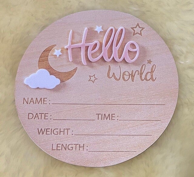 Leg het bijzondere moment van de geboorte van jouw baby vast met dit prachtige “Hello World” geboortebordje. Dit stijlvolle ronde bordje is perfect om naast je pasgeboren baby te leggen voor een mooie eerste foto en om alle belangrijke geboortegegevens vast te leggen.